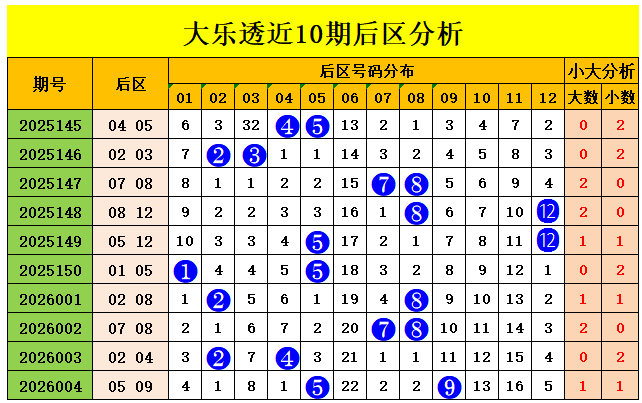 后区近10期大小比为9:11,小码奖号走势稍热,上期开出小大组合,近3期开出,大大、小小、小大、组合,本期后区推荐大大组合;
