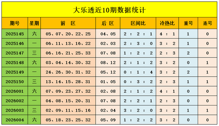 上期回顾:大乐透第2026004期奖号为:前区05、18、23、25、32,后区05、09,前区奖号三区比为1:2:2,冷热比为3:2,后区开出小大组合05、09