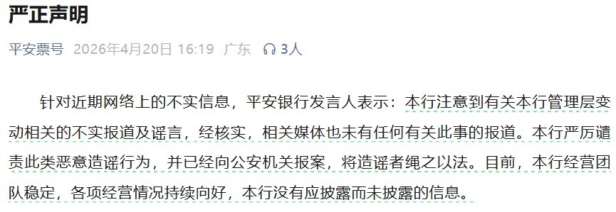 【大河财立方消息】4月20日,平安银行发布声明称,“注意到有关本行管理层变动相关的不实报道及谣言,经核实,相关媒体也未有任何有关此事的报道。”
