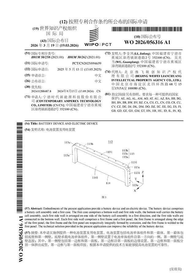 证券之星消息,根据企查查数据显示宁德时代(300750)公布了一项国际专利申请,专利名为“电池装置及用电装置”,专利申请号为PCT/CN2025/094659,国际公布日为2026年3月19日。